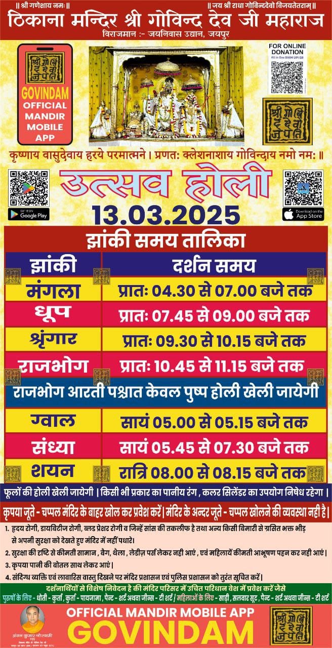Read moreटुडे इंडिया ख़बर / संतोष वशिष्ठजयपुर, 11 मार्च, 2025 जयपुर के आराध्य देव गोविंद देव जी मंदिर में 13 मार्च को होलीका दहन का विधिवत मंत्र उच्चारण के साथ आयोजन…